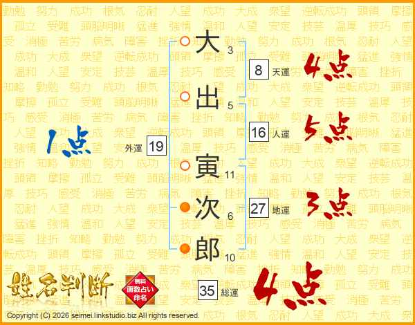 大(3画)出(5画) 寅(11画)次(6画)郎(10画)