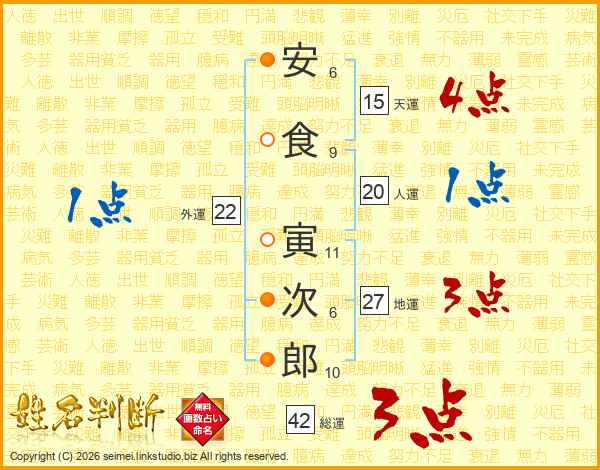 安(6画)食(9画) 寅(11画)次(6画)郎(10画)