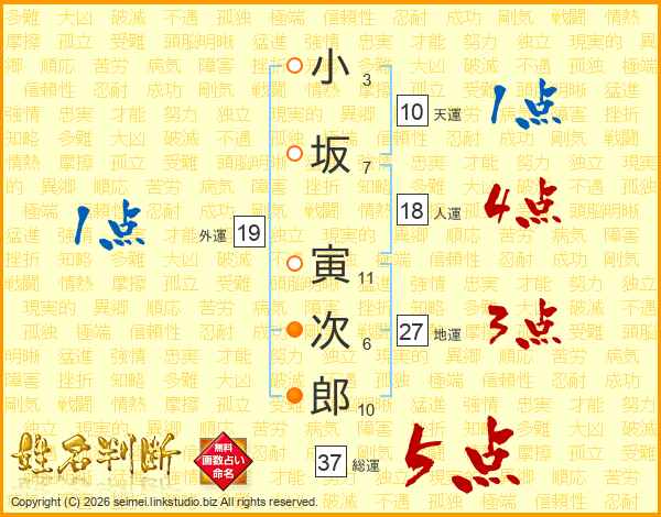 小(3画)坂(7画) 寅(11画)次(6画)郎(10画)