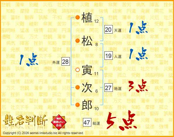 植(12画)松(8画) 寅(11画)次(6画)郎(10画)