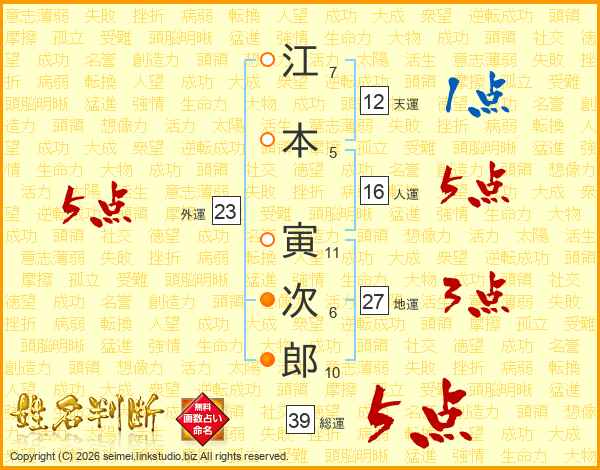 江(7画)本(5画) 寅(11画)次(6画)郎(10画)