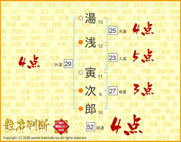 湯(13画)浅(12画) 寅(11画)次(6画)郎(10画)