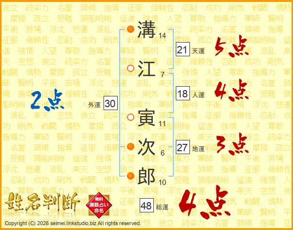 溝(14画)江(7画) 寅(11画)次(6画)郎(10画)