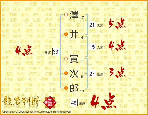 澤(17画)井(4画) 寅(11画)次(6画)郎(10画)