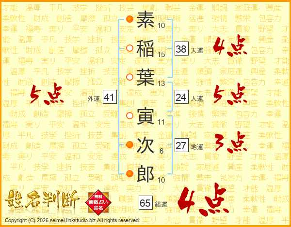 素(10画)稲(15画)葉(13画) 寅(11画)次(6画)郎(10画)