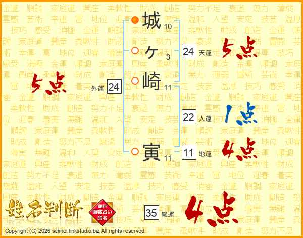生活面を象徴する運勢です。外部から受ける影響力を表し、結婚運、家庭運や職場、環境への順応性を表します。総運から人運を引いた画数。姓や名が1文字の場合を除く。