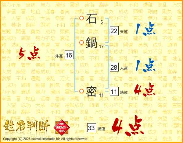 石鍋密さんの総運は33画の4点!