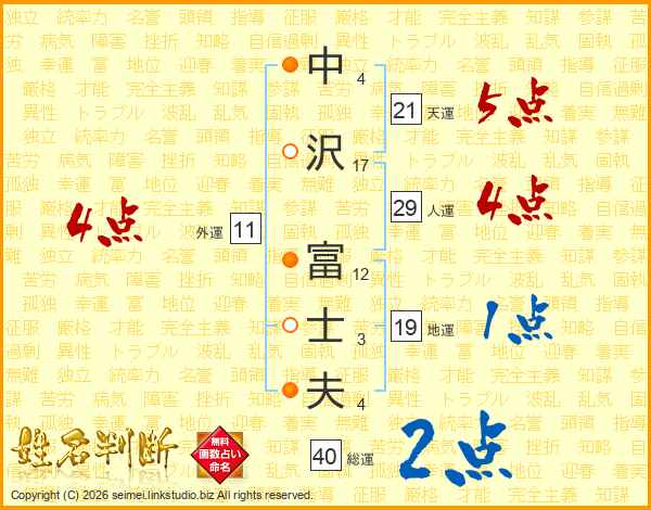 中(4画)沢(17画) 富(12画)士(3画)夫(4画)
