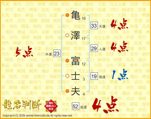 亀(16画)澤(17画) 富(12画)士(3画)夫(4画)