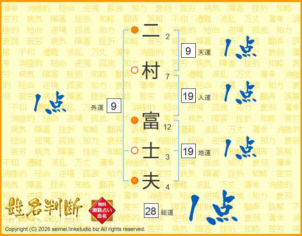 二(2画)村(7画) 富(12画)士(3画)夫(4画)