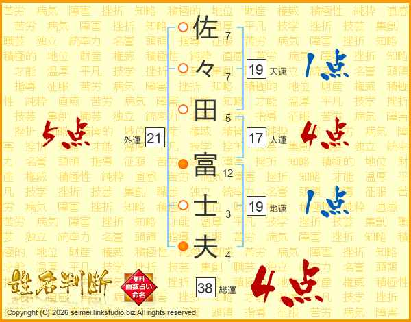 佐(7画)々(7画)田(5画) 富(12画)士(3画)夫(4画)