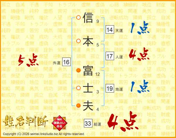 信(9画)本(5画) 富(12画)士(3画)夫(4画)