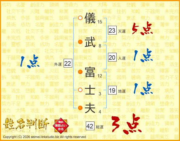 儀(15画)武(8画) 富(12画)士(3画)夫(4画)