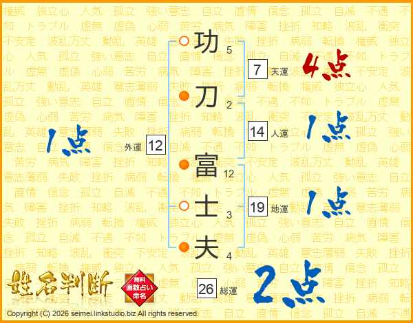 功(5画)刀(2画) 富(12画)士(3画)夫(4画)