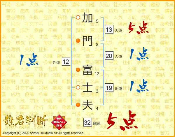 加(5画)門(8画) 富(12画)士(3画)夫(4画)
