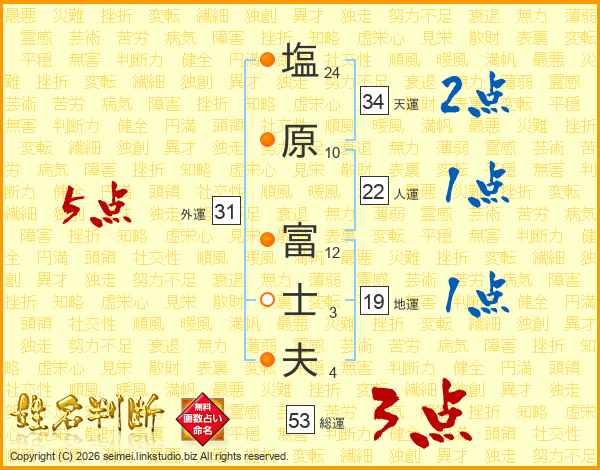 塩(24画)原(10画) 富(12画)士(3画)夫(4画)