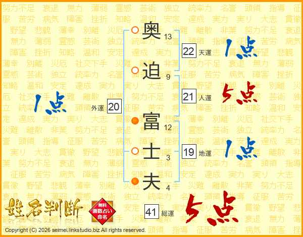 奥(13画)迫(9画) 富(12画)士(3画)夫(4画)