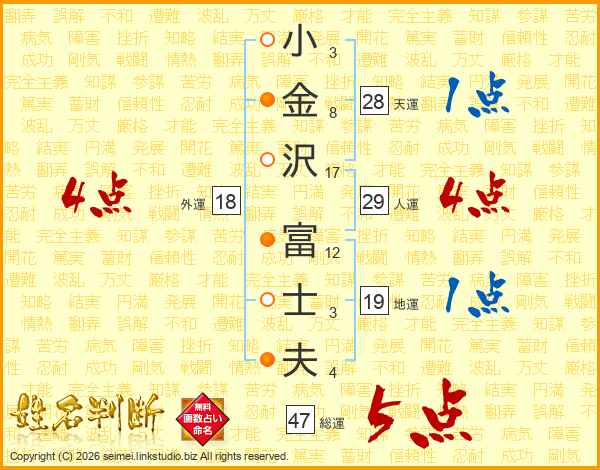 小(3画)金(8画)沢(17画) 富(12画)士(3画)夫(4画)