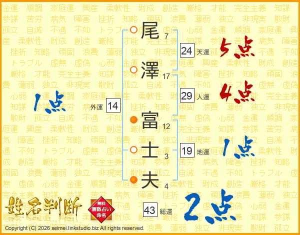 尾(7画)澤(17画) 富(12画)士(3画)夫(4画)