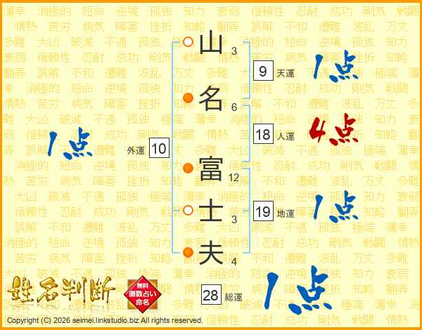 山(3画)名(6画) 富(12画)士(3画)夫(4画)
