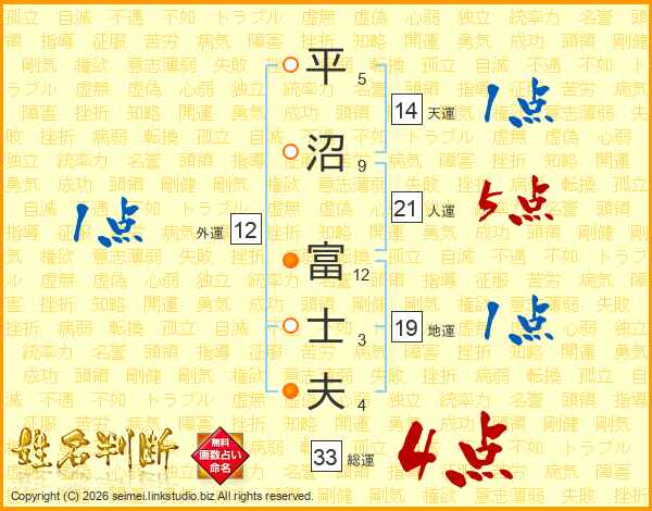 平(5画)沼(9画) 富(12画)士(3画)夫(4画)