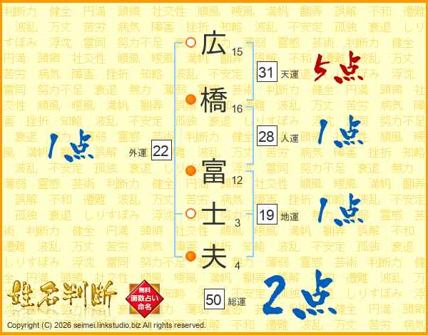 広(15画)橋(16画) 富(12画)士(3画)夫(4画)