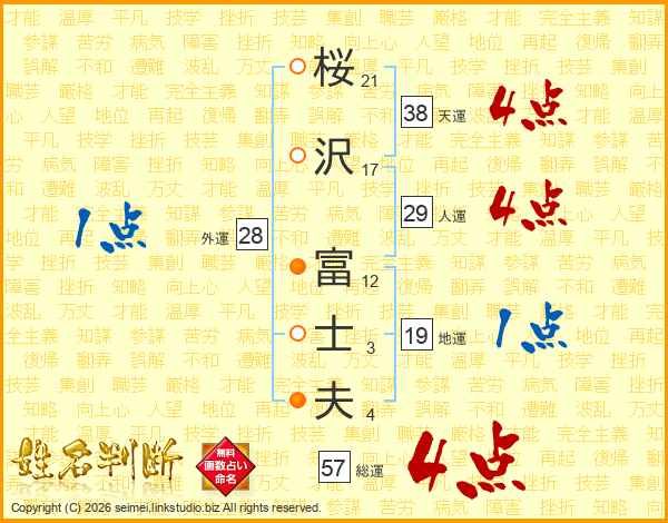 桜(21画)沢(17画) 富(12画)士(3画)夫(4画)