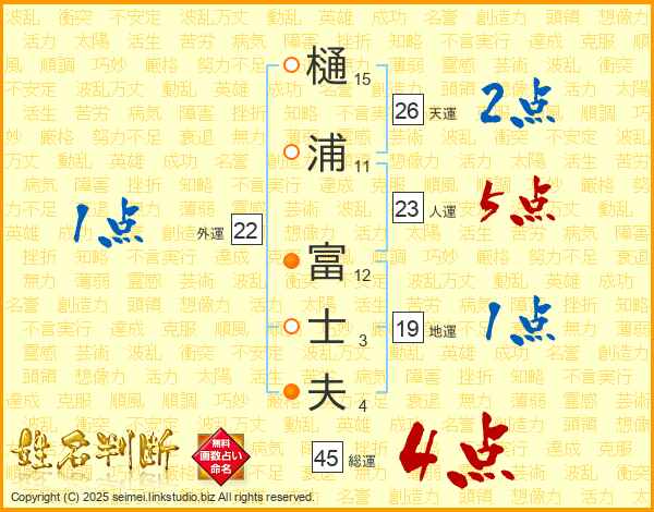 樋(15画)浦(11画) 富(12画)士(3画)夫(4画)