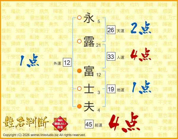 永(5画)露(21画) 富(12画)士(3画)夫(4画)