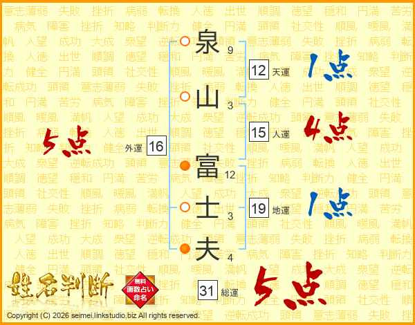 泉(9画)山(3画) 富(12画)士(3画)夫(4画)