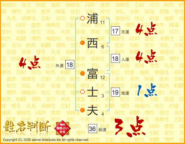 浦(11画)西(6画) 富(12画)士(3画)夫(4画)