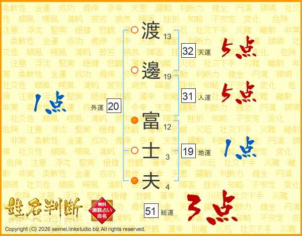 渡(13画)邊(19画) 富(12画)士(3画)夫(4画)