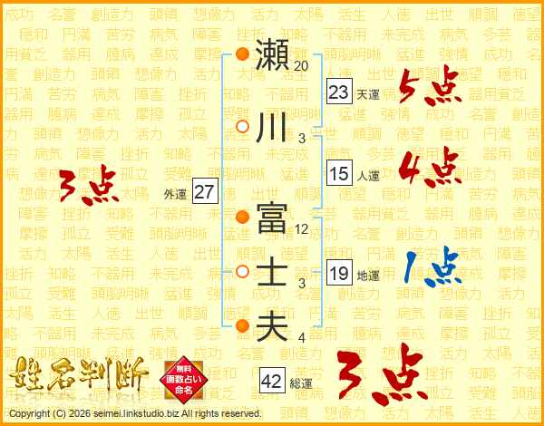 瀬(20画)川(3画) 富(12画)士(3画)夫(4画)