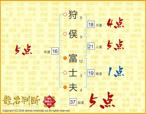 狩(9画)俣(9画) 富(12画)士(3画)夫(4画)