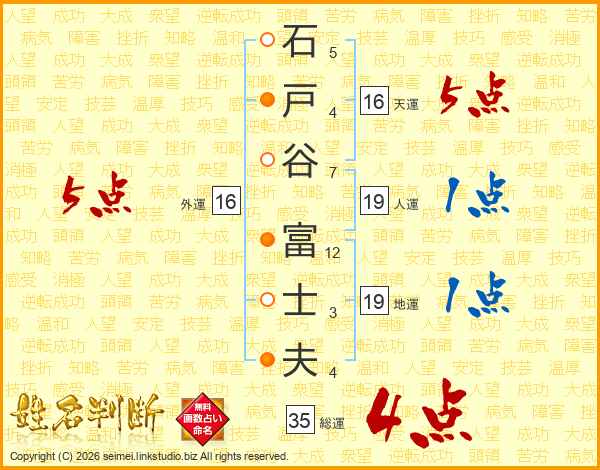 石(5画)戸(4画)谷(7画) 富(12画)士(3画)夫(4画)