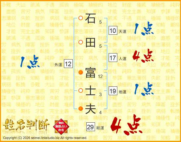 石(5画)田(5画) 富(12画)士(3画)夫(4画)