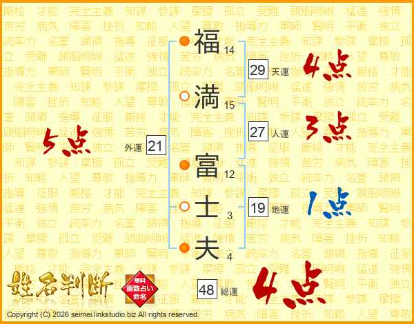 福(14画)満(15画) 富(12画)士(3画)夫(4画)