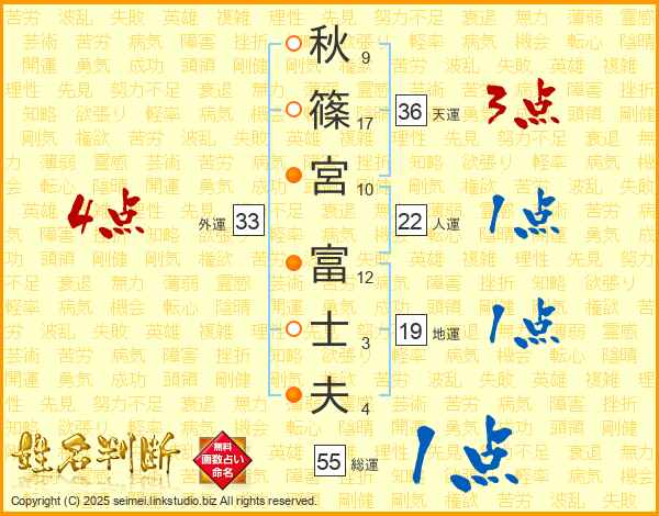 秋(9画)篠(17画)宮(10画) 富(12画)士(3画)夫(4画)