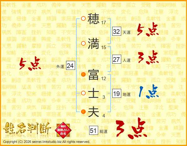 穂(17画)満(15画) 富(12画)士(3画)夫(4画)