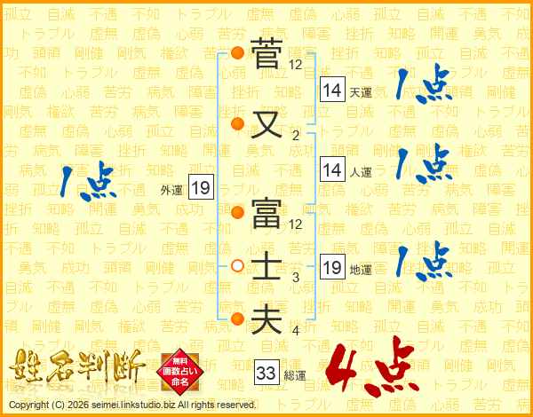 菅(12画)又(2画) 富(12画)士(3画)夫(4画)