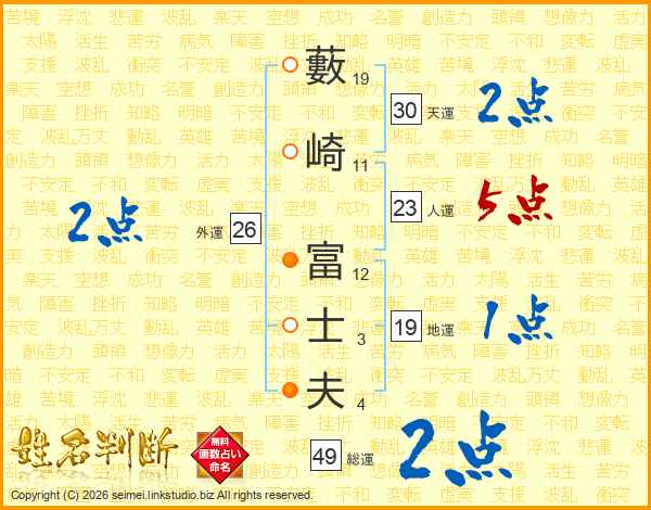 藪崎富士夫さんの人運は23画の5点!
