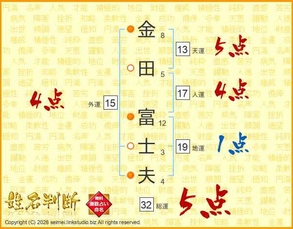 金(8画)田(5画) 富(12画)士(3画)夫(4画)
