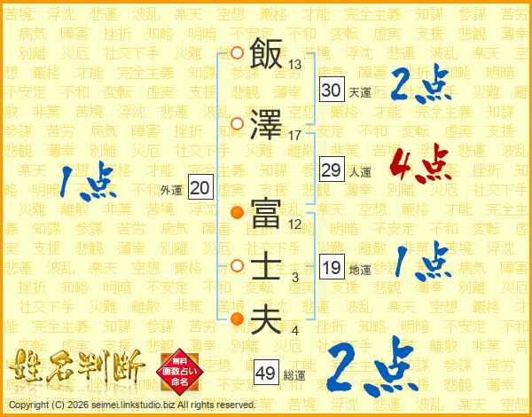 飯(13画)澤(17画) 富(12画)士(3画)夫(4画)