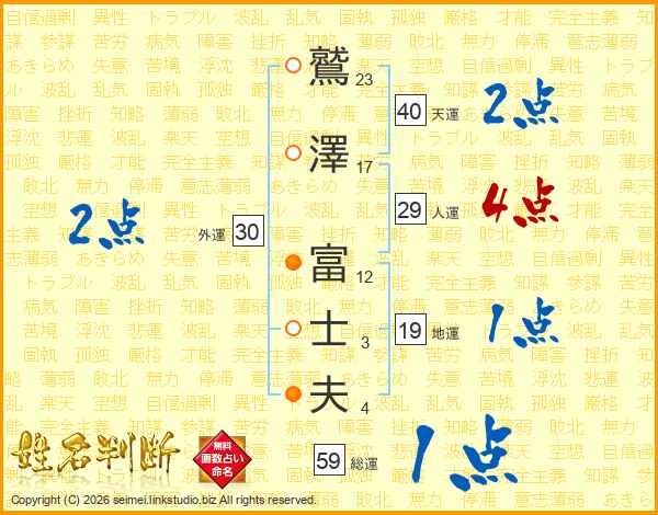 鷲(23画)澤(17画) 富(12画)士(3画)夫(4画)
