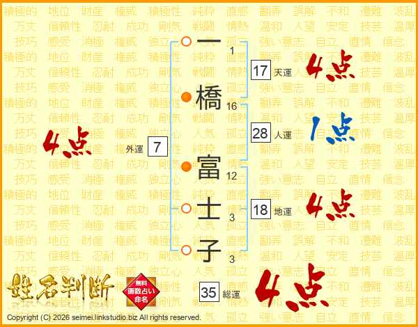一(1画)橋(16画) 富(12画)士(3画)子(3画)