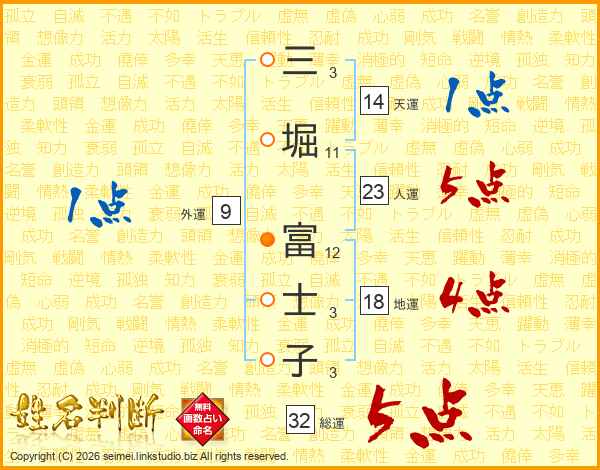 三(3画)堀(11画) 富(12画)士(3画)子(3画)
