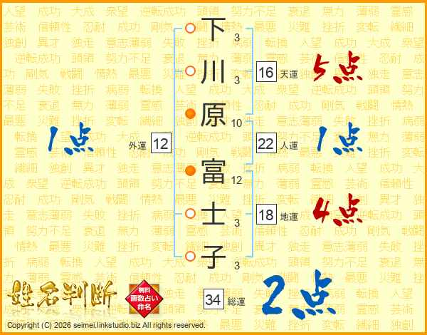 生活面を象徴する運勢です。外部から受ける影響力を表し、結婚運、家庭運や職場、環境への順応性を表します。総運から人運を引いた画数。姓や名が1文字の場合を除く。
