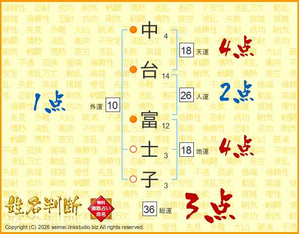 中(4画)台(14画) 富(12画)士(3画)子(3画)