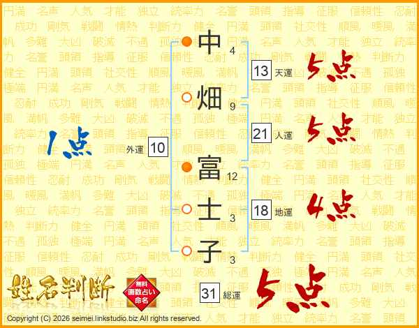 中(4画)畑(9画) 富(12画)士(3画)子(3画)