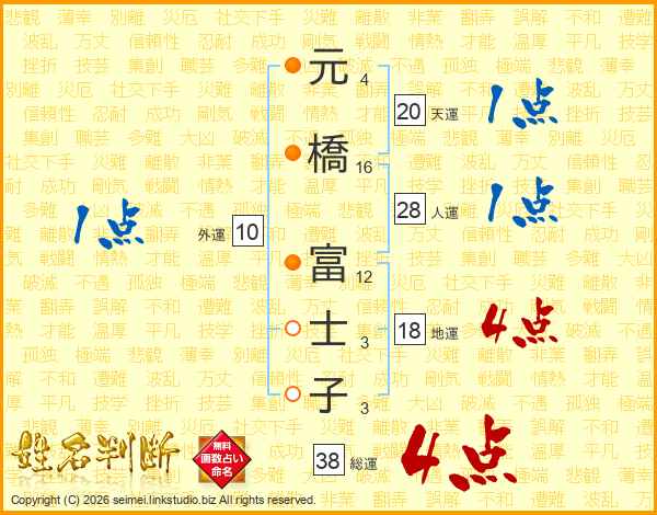 元(4画)橋(16画) 富(12画)士(3画)子(3画)